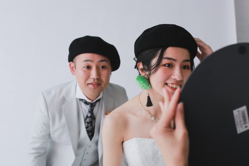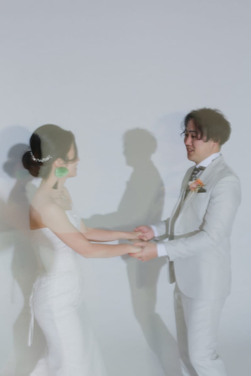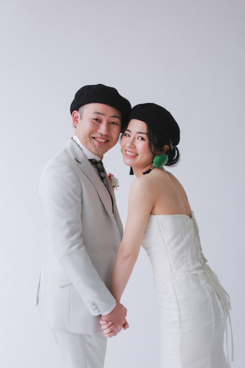 スタジオ撮影は背景は全て白なのでポーズや表情、お持込の小物などでお二人のお好きな雰囲気に自由自在です♪