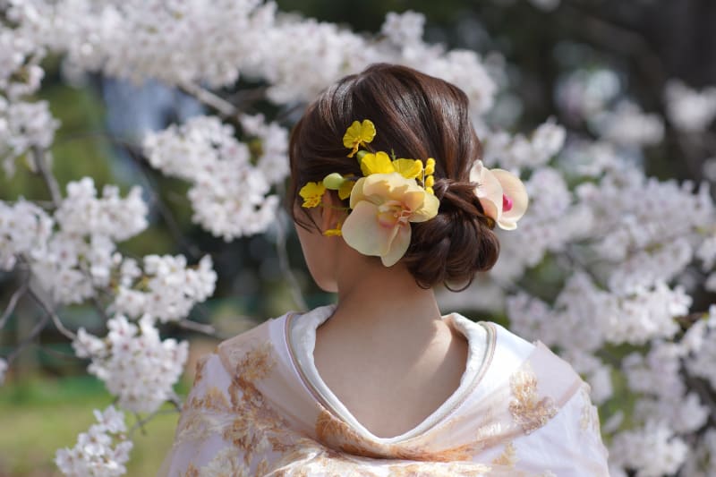 ヘアはふわふわすぎないシニヨンで、髪飾りは黄色のマルレとあわせてピンクの胡蝶蘭に差し色に黄色のお花🌼