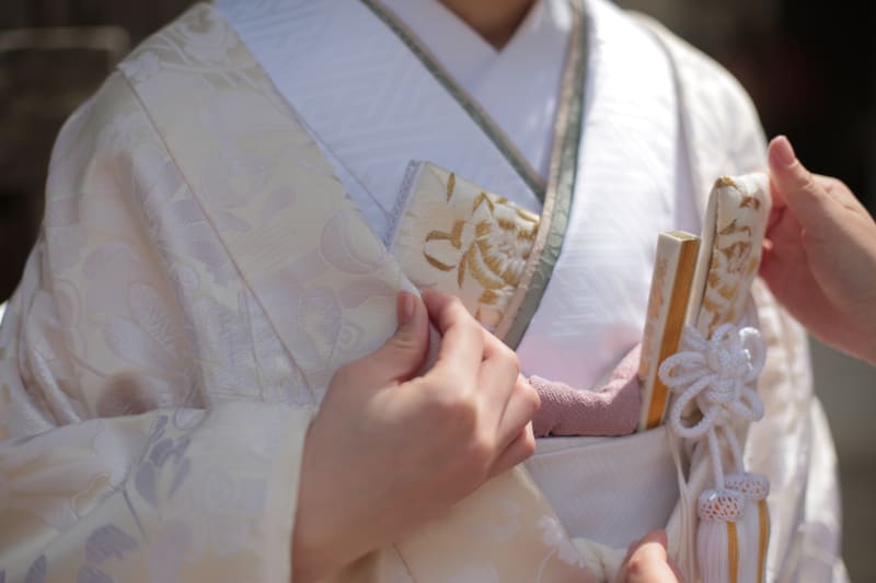 白無垢にポイントで柔らかい色味のコーディネートの新婦様