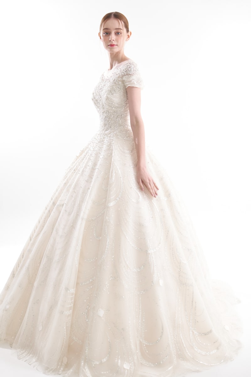 繊細なビーズとパールが贅沢にあしらわれていて、上品さと華やかさを兼ね備えたまさに”憧れのドレス”です