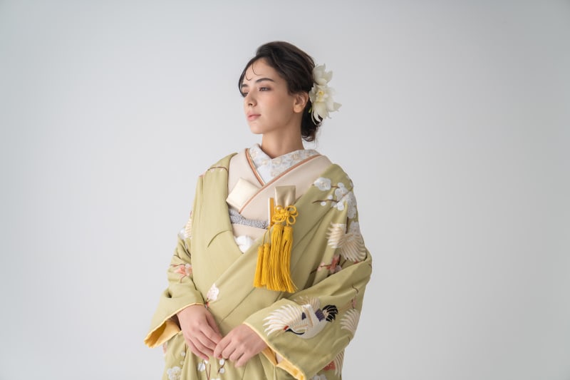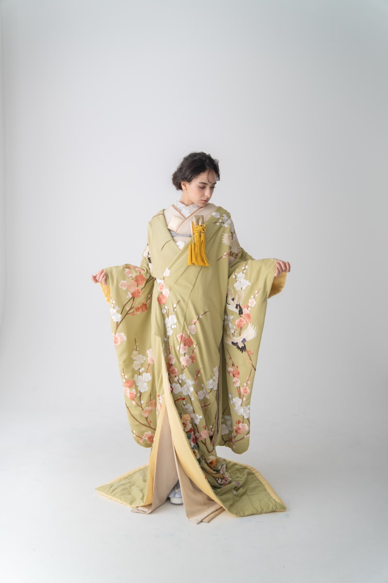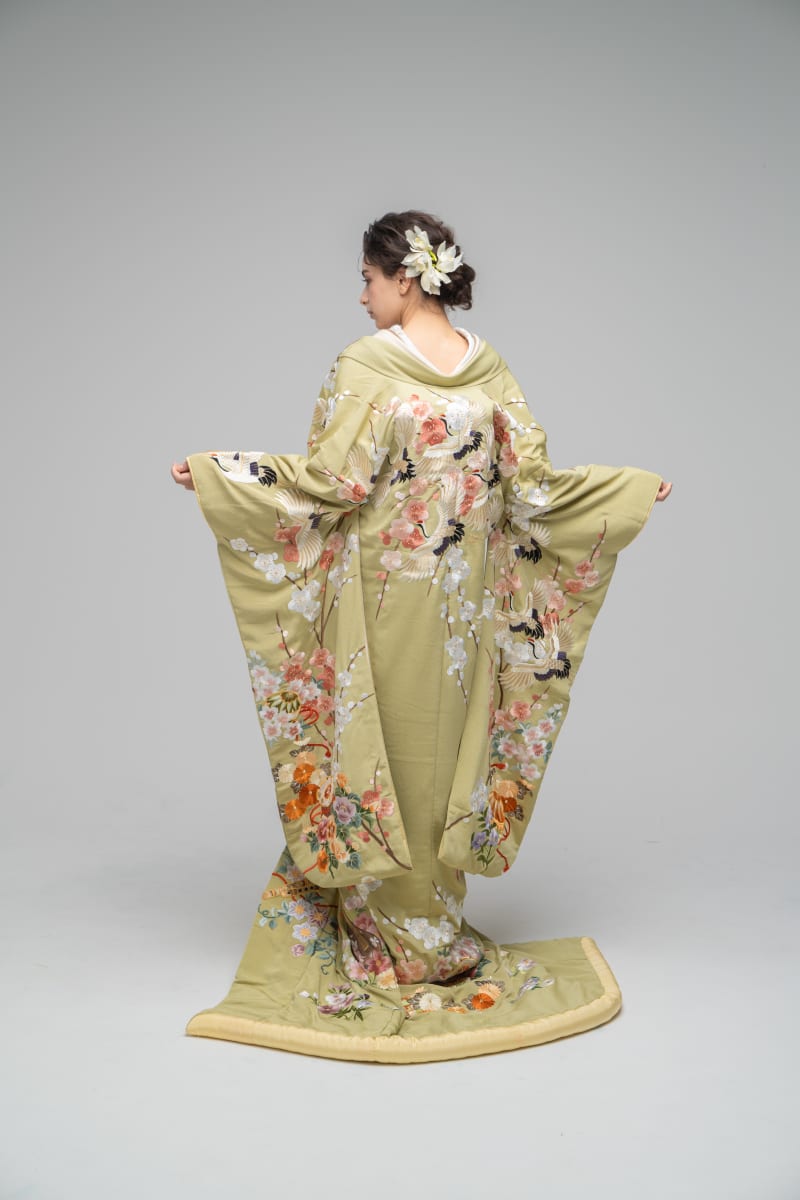 今回は、まるで一枚の絵画。気品と幸福を纏う、抹茶色の色打掛を紹介します。