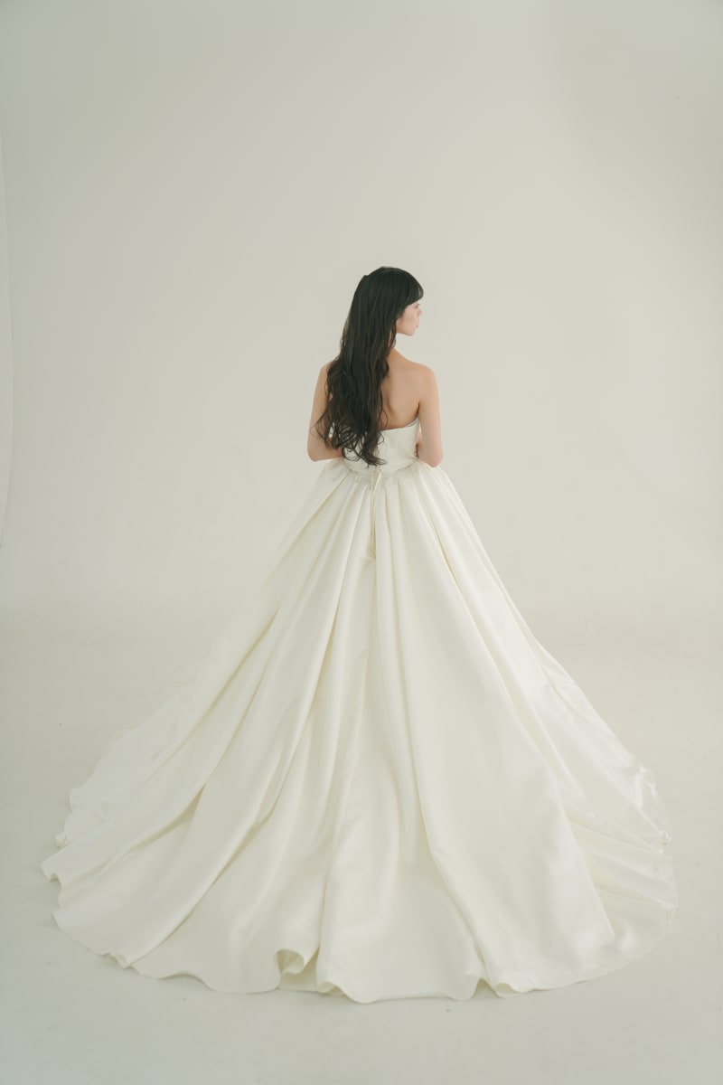 長く伸びるトレーンは、後ろ姿にドラマティックな雰囲気をプラスしてくれます。 まるで物語から飛び出してきたような、ロマンティックな一枚が残せること間違いなし! チャペルでの撮影はもちろん、広々としたロケーションでの撮影でも、きっと素敵な写真が撮れますよ。
