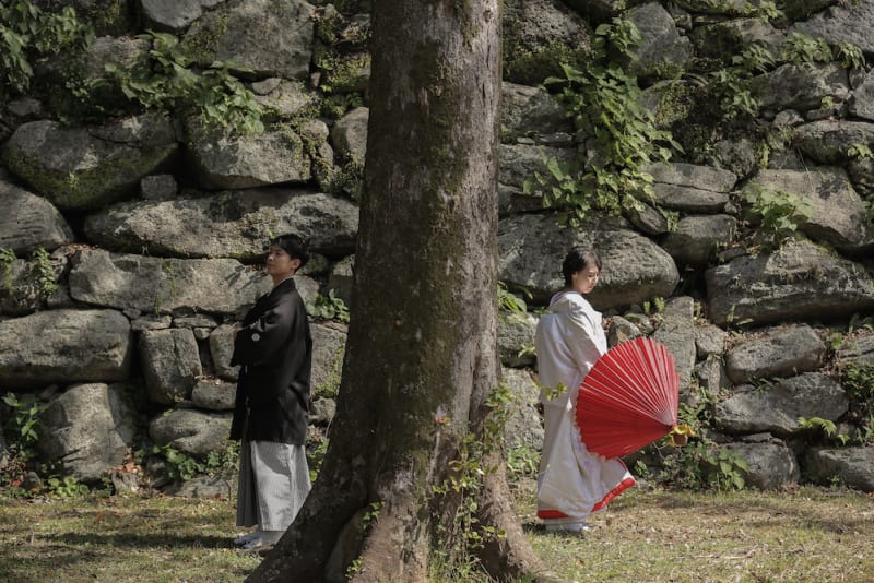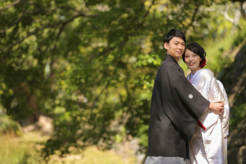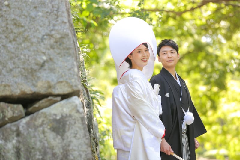 白の外壁や緑の木々をバックに白無垢と紋付がとても綺麗に映えてました