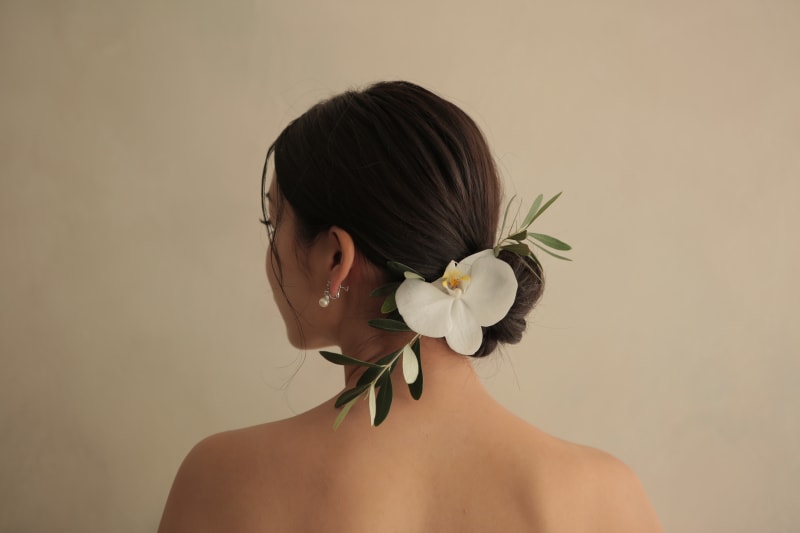 ご持参いただいた生花を使用しておくれ毛を顔周りに出しました。