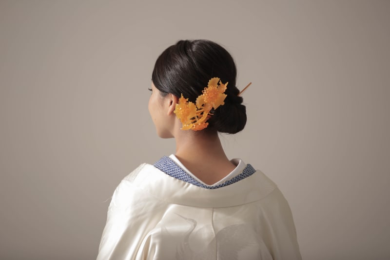 髪型は洋髪ですが、べっ甲のかんざしを挿して