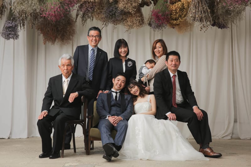 みなさんで集合写真。結婚写真なので、もちろんこんなカチッとしたスタイルでも撮影します!