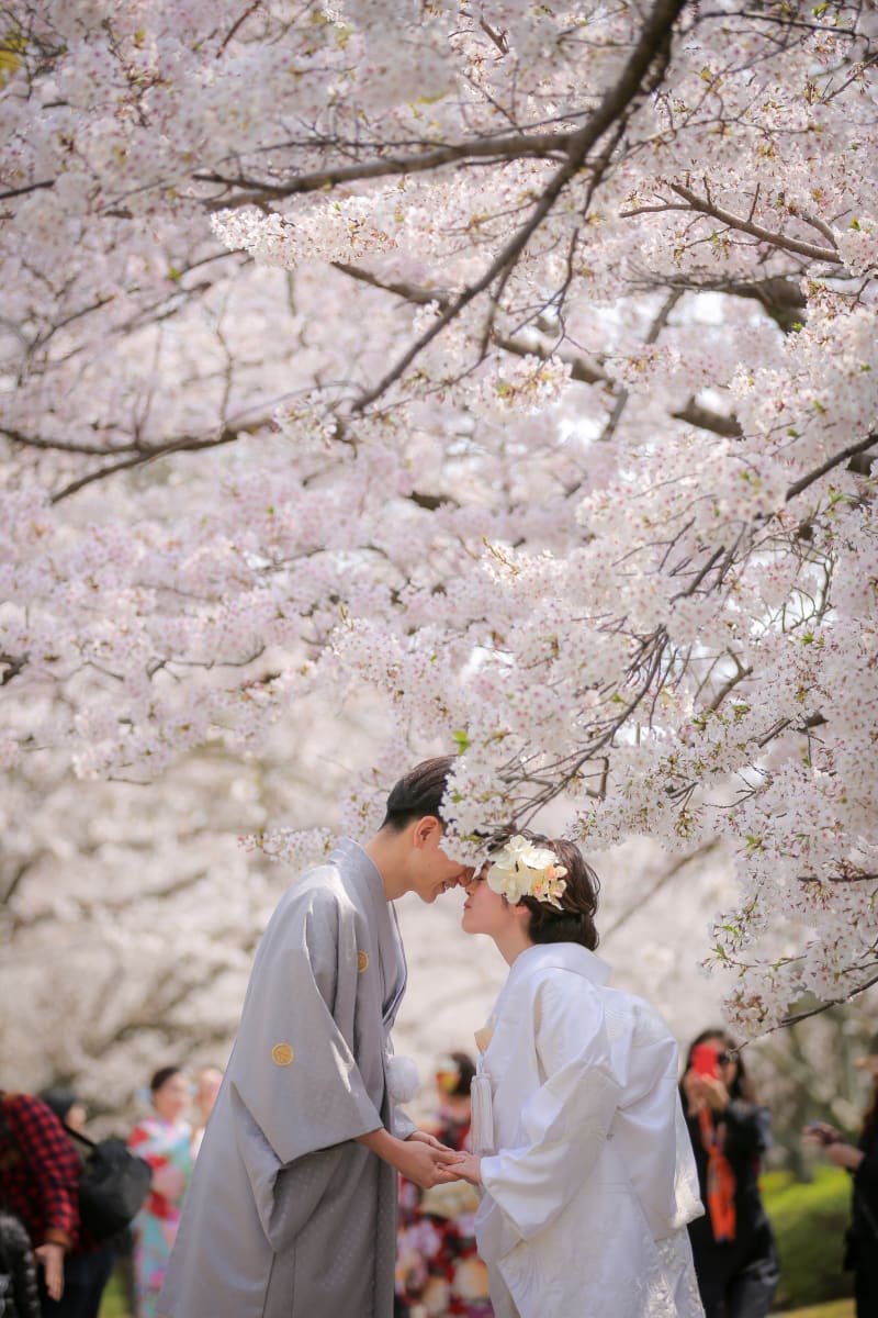 桜にお顔が隠れてお鼻をくっつけているおふたり