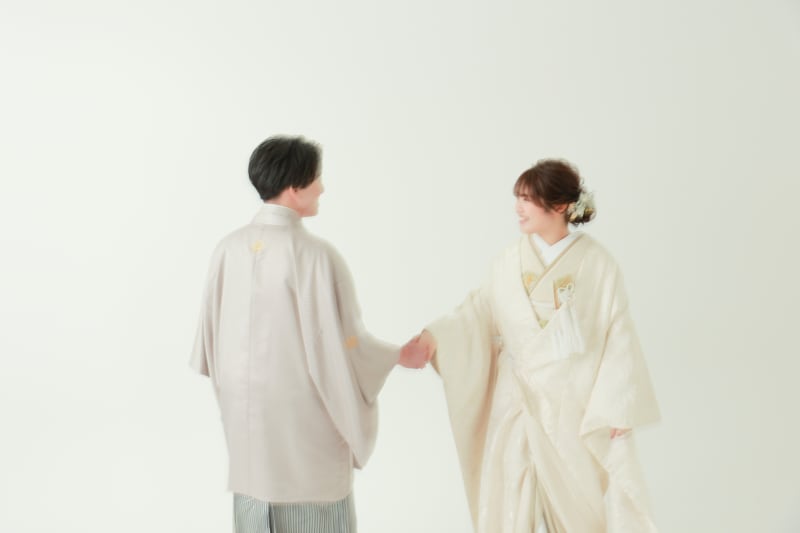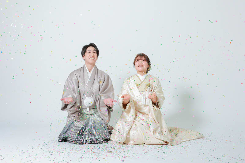 →白背景でポージングの指定などはなくおふたりの雰囲気や持ち込みの小物などを使用しておしゃれにお二人らしいお写真を撮影するプラン