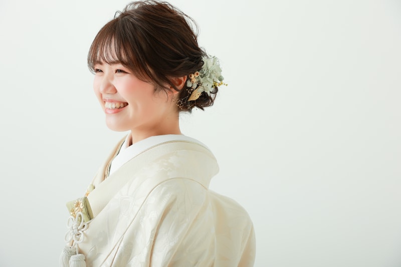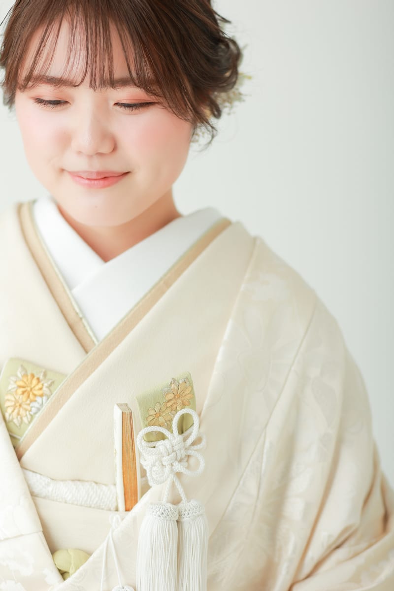 今回は着物のコーディネイトもグリーンベージュ系でまとめ柔らかい雰囲気の白無垢に