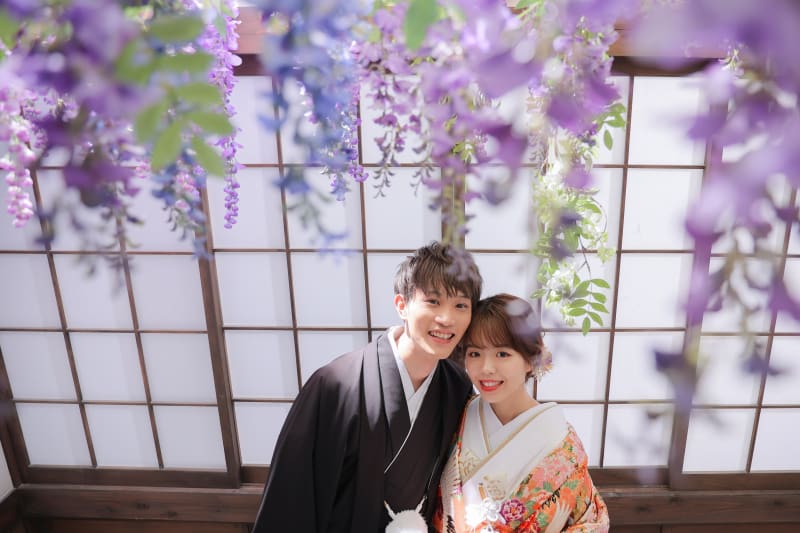 藤の花が咲いた庭園では白無垢はもちろん、色打掛もあい相性◎