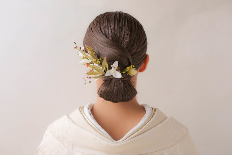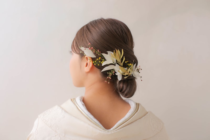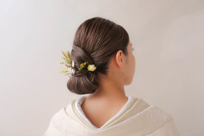正面から見たとき比較的シンプルなので和装では髪飾り、洋装ではアクセサリー類で一気に雰囲気も変わり