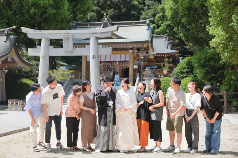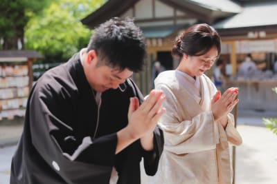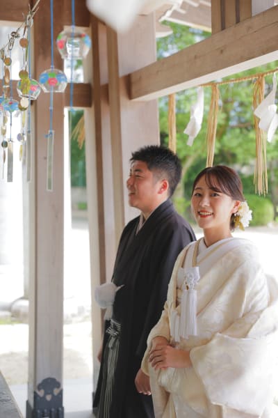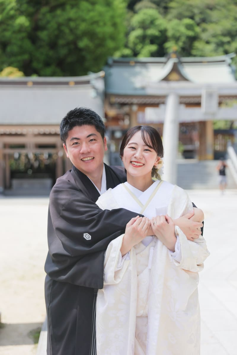 伝統的な白無垢×黒紋付姿がとても美しく、参拝者の目を釘付けにしていました。