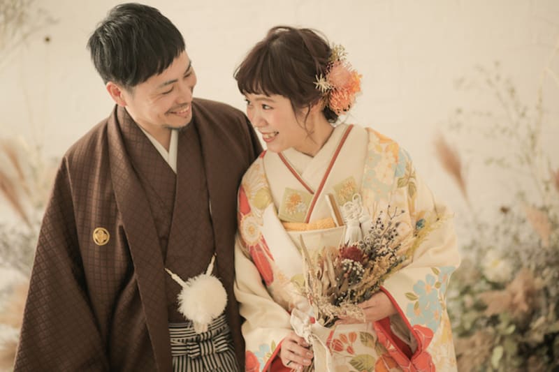 お着物の柄や色味に合わせて小物や新郎様の色紋付もブラウンに