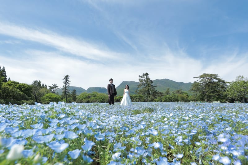 一面のネモフィラとくじゅうの山々をバックに残したお写真、とっても素敵です!!