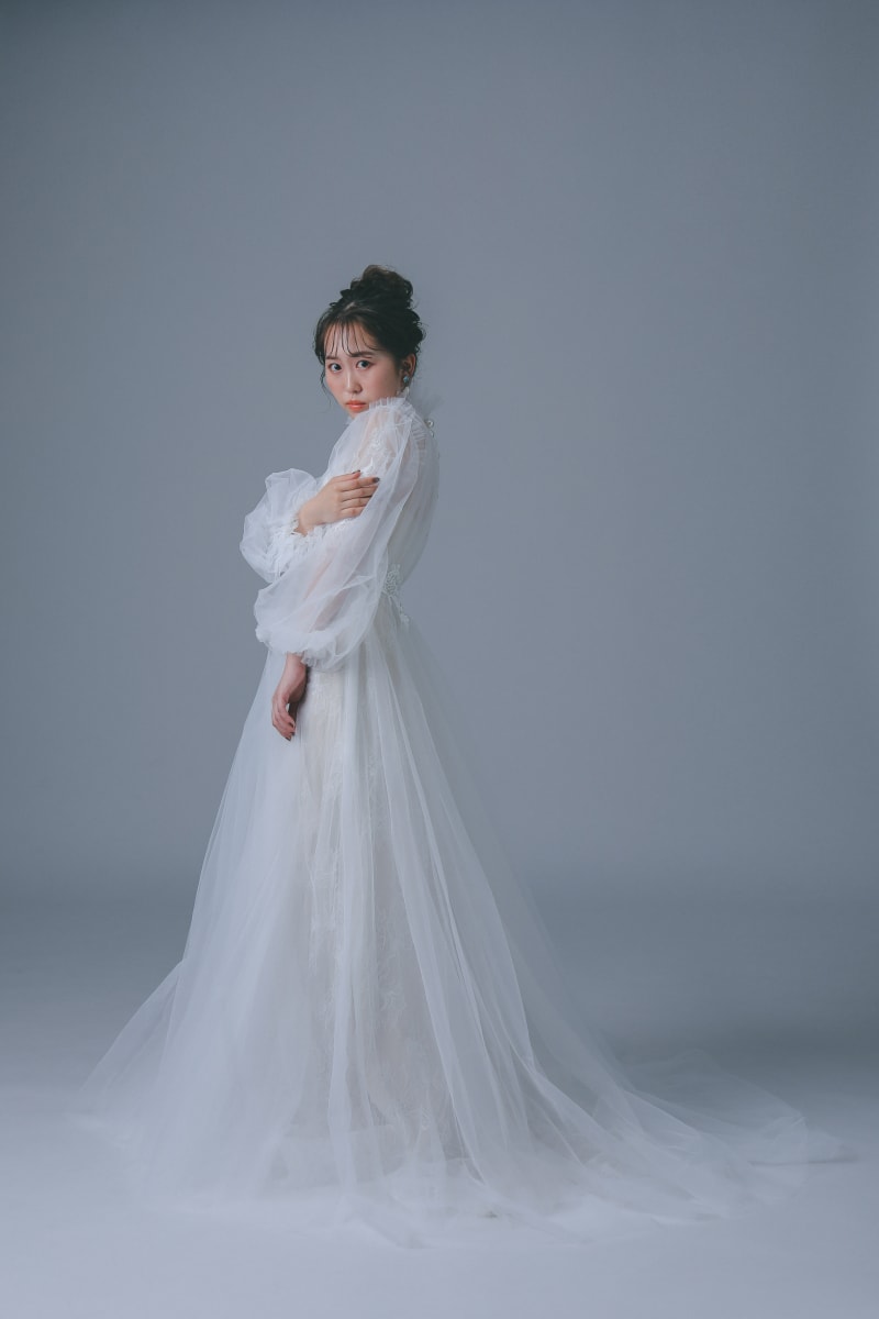 ハイネックと聞けば重たい印象になるんじゃないかな、、と心配になる方もいると思いますが、今回のドレスは全体的に透け感があり質感の軽い印象のドレスとなっております。