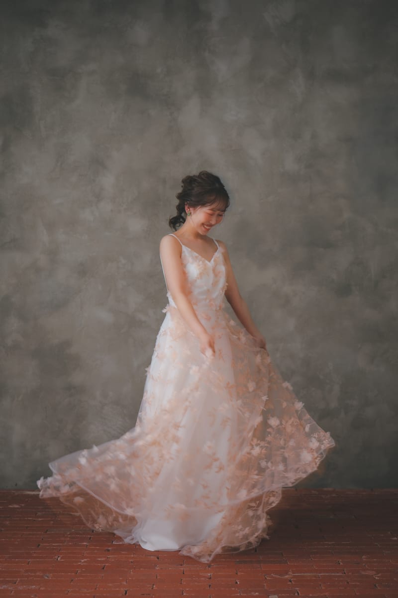 ベビーピンクのボタニカルレースが肌馴染み良く、日本人には着用しやすいドレスとなっております。