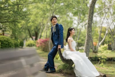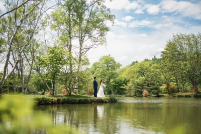 澄み渡る空の下、静かな自然に囲まれた軽井沢のロケーションは、お二人の優しさと笑顔を引き立てる最高の舞台となりました。