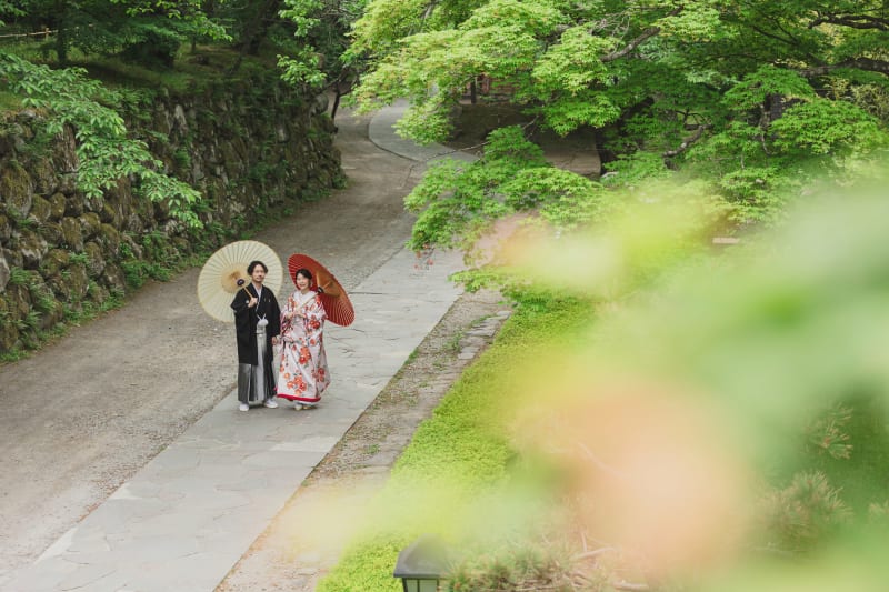 緑がたっぷりの小諸懐古園で和装撮影開始!