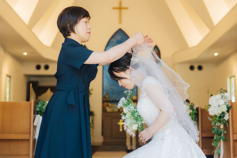 ベールダウンとは、結婚式の挙式直前に、新婦の母親や大切な人が新婦のウェディングベールを顔にかける儀式のことです。この儀式には、「新婦を災いから守る」「母親による最後の身支度」といった意味が込められています。
