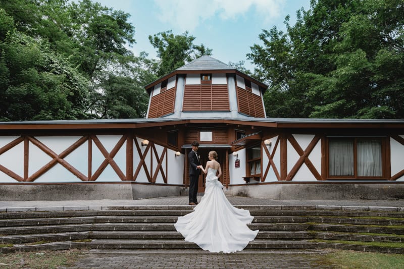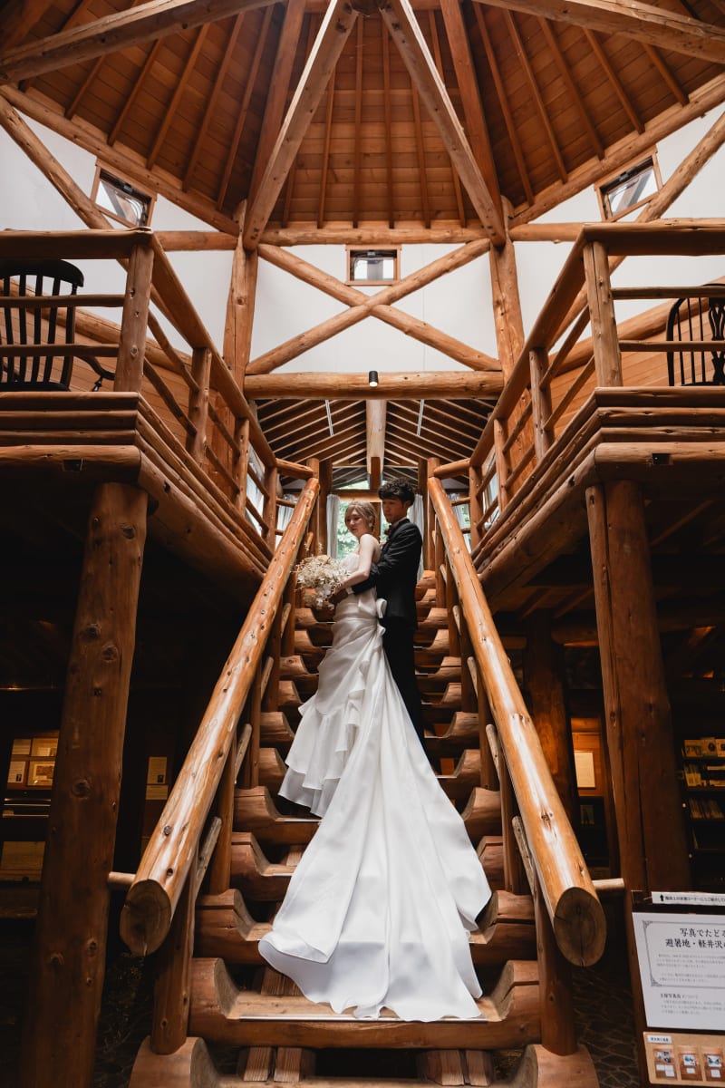 木の階段での撮影はドレスのトレーンも綺麗に撮影できるのも素敵です♡