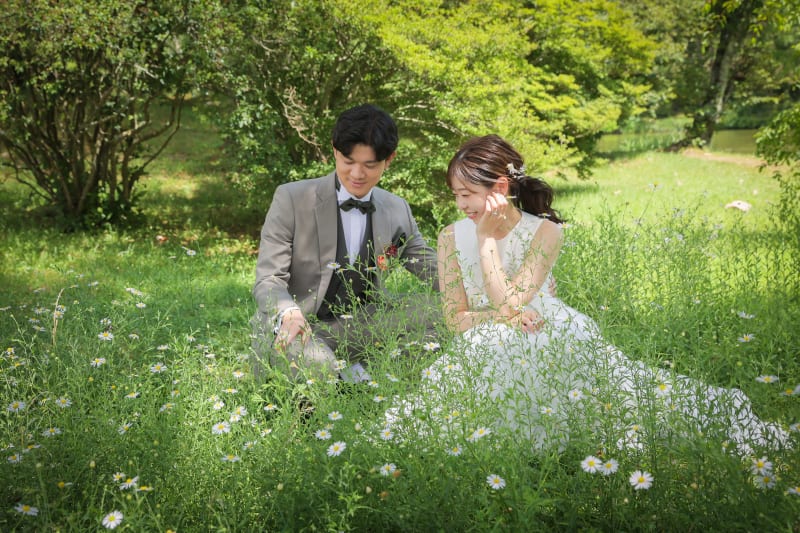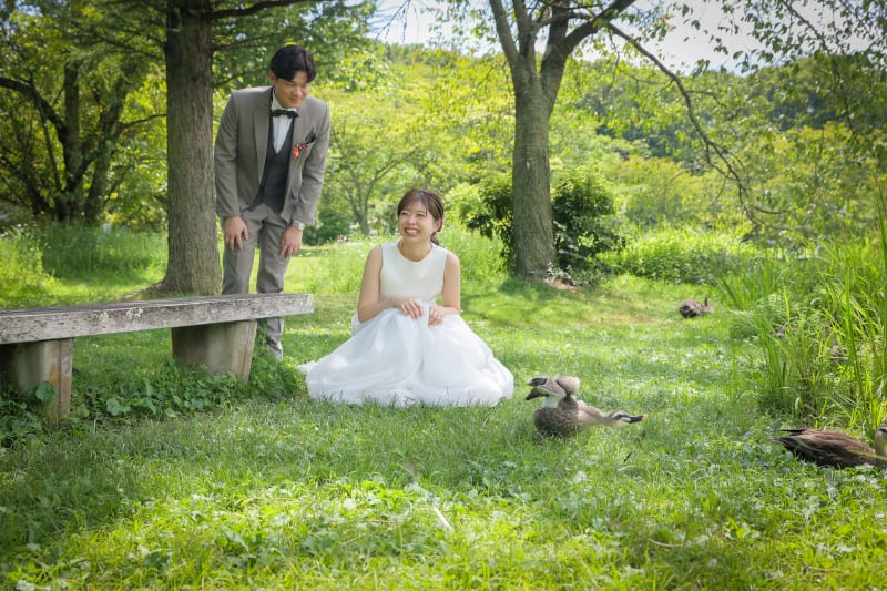 撮影中に花畑で鴨に出会うという、まるでディズニー映画みたいなシーンも!ご新婦様がとにかく可愛すぎました♡ そんな姿を後ろから優しく見守るご新郎様も素敵でした〜!