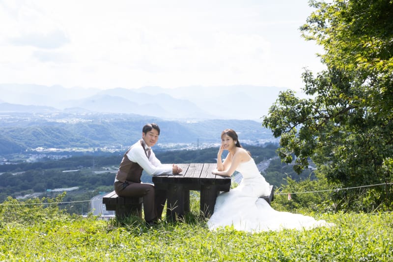 こんにちは!スタジオアクア軽井沢店カメラマンのインでございます。本日は洋装でタリアセンと飯綱山公園で撮影されたお二人のご紹介です。