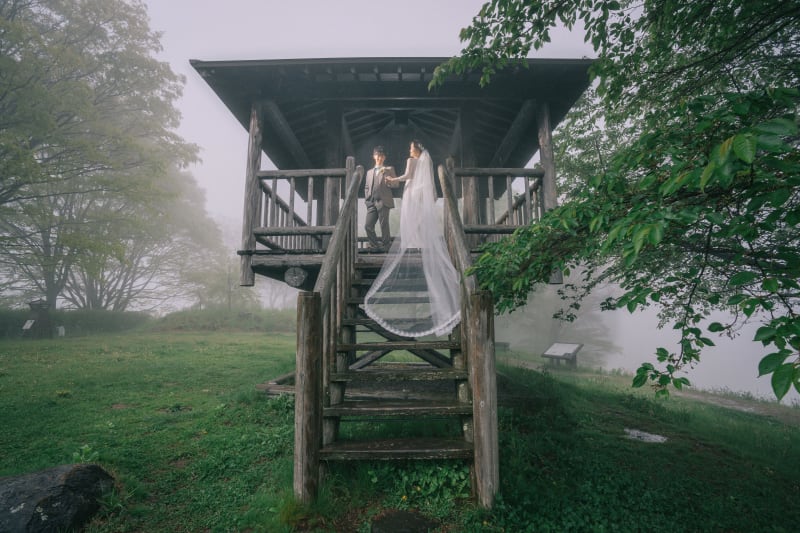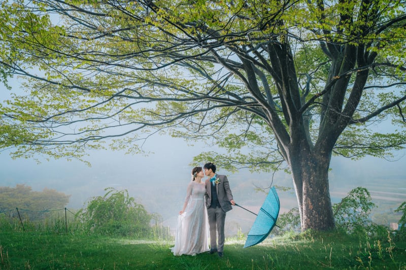 雨の日だからこそ幻想的な景色の中で残すブライダルフォト♪