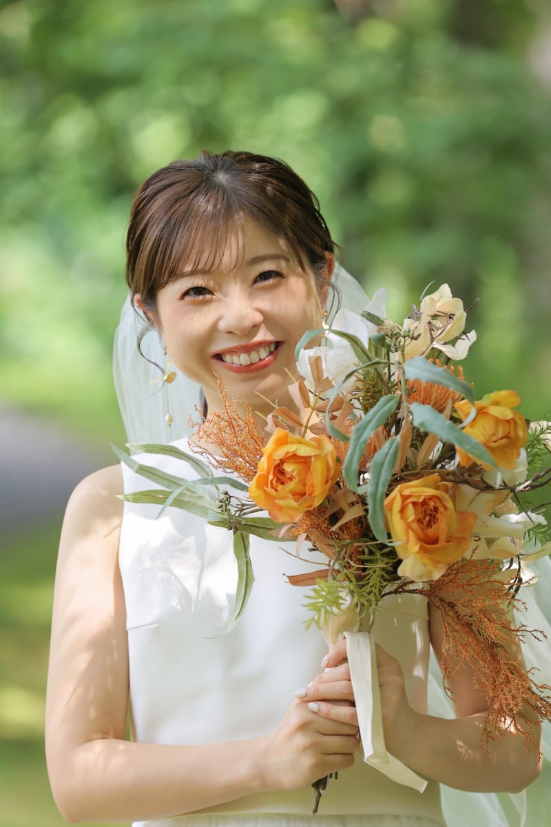 オレンジのブーケが白いドレスに映えて、とても華やか。
