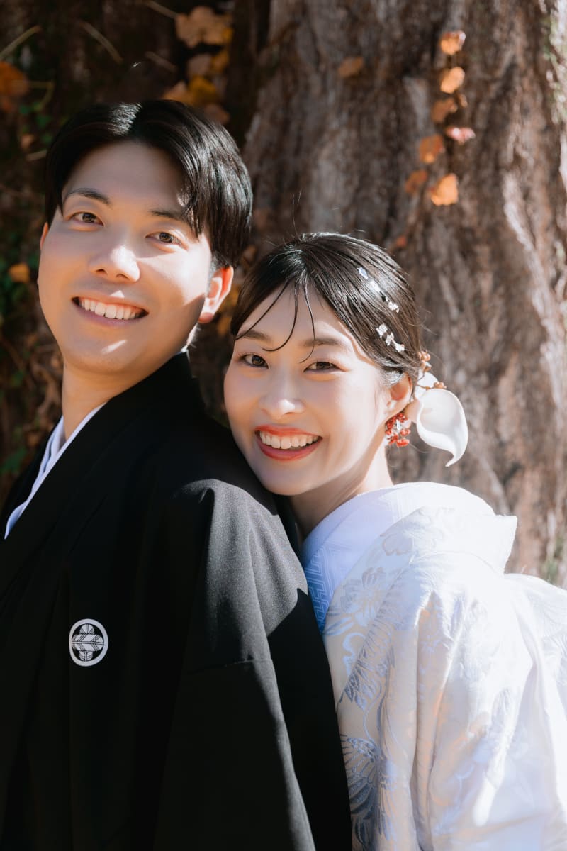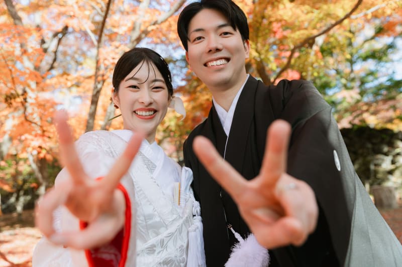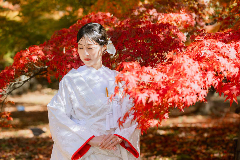 和装で紅葉は特別ですよね、真っ赤な紅葉が白無垢にも映えてます。