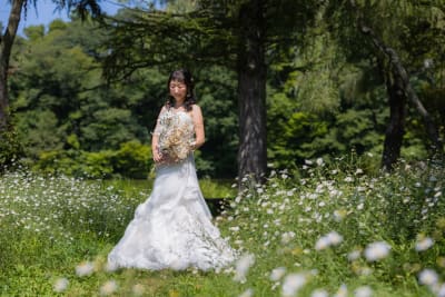 ご新婦様のソロ写真はハルジオンがたくさん咲いていてすごく素敵な1枚に。
