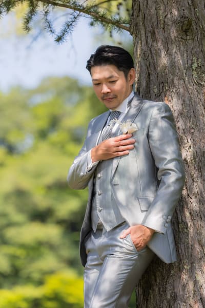 ご新郎様のソロ写真は緑をバックにかっこよく。