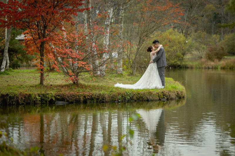 広い敷地内には、撮影スポットも豊富。ふんわりとした芝生や、さわやかな白樺の木々、湖に掛かる橋、歴史ある建築物など、軽井沢らしいナチュラルなウェディングフォトを撮ることができます。