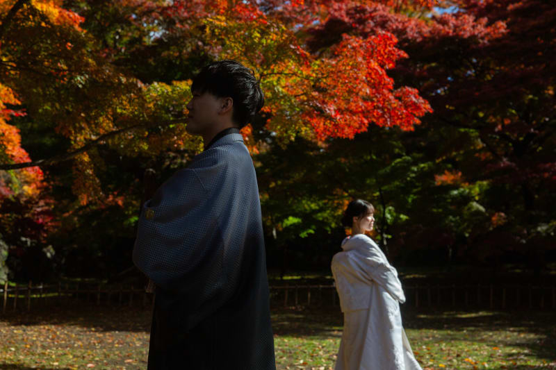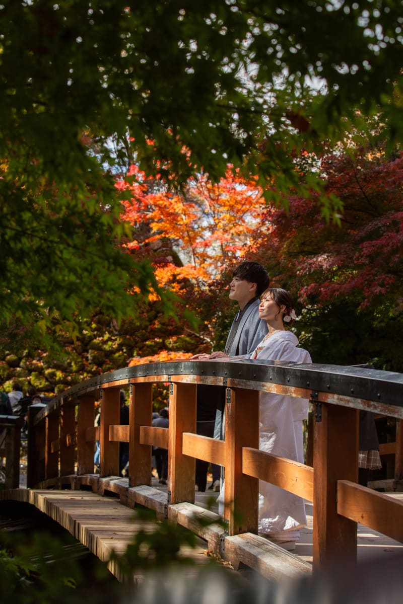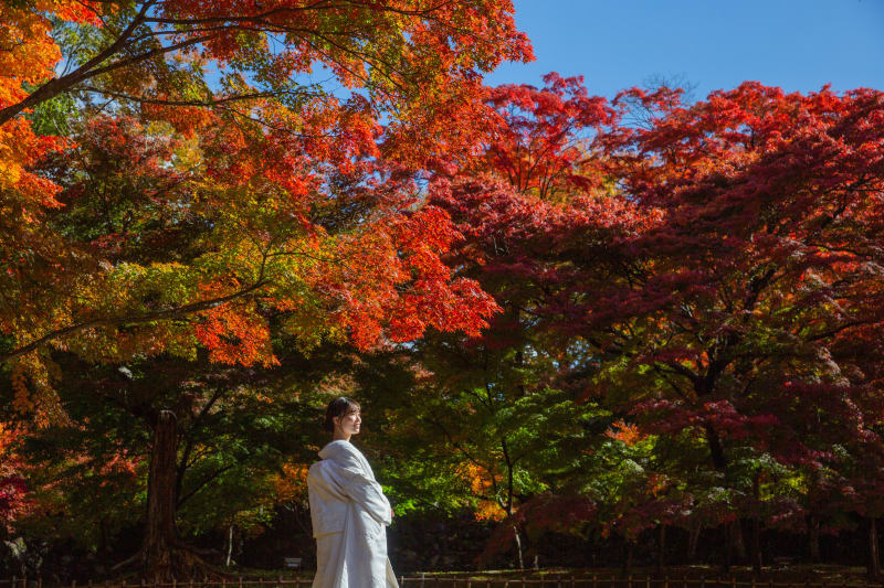 紅葉に染まった背景に新婦様の白無垢が良く映えます。