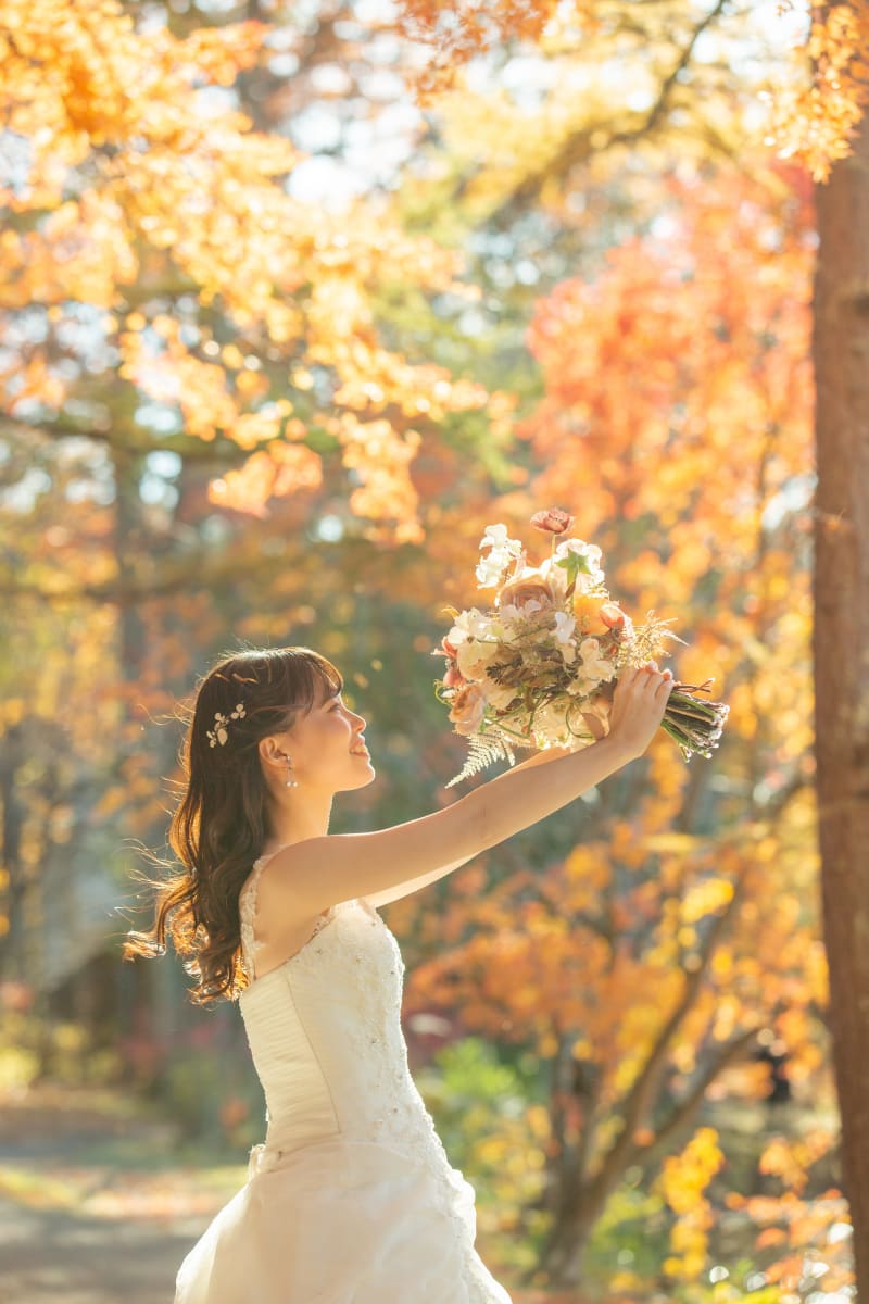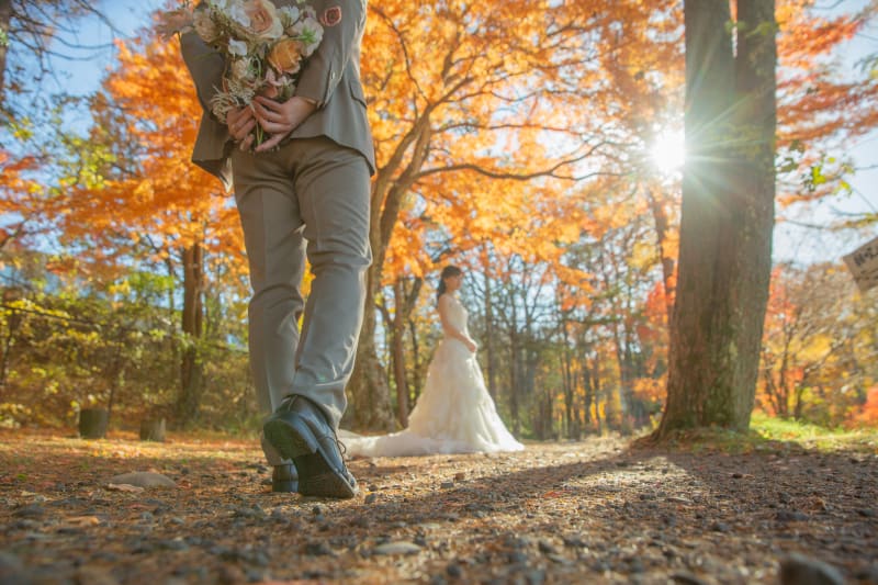紅葉がピークを迎えたタリアセン。ブーケを届けにいく新郎様