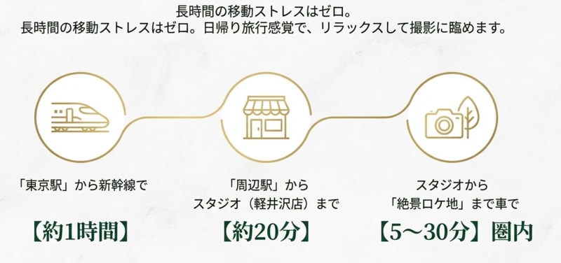 軽井沢は都内からのアクセスも良く、自然に囲まれたロケーションで特別な写真を残すことができます。