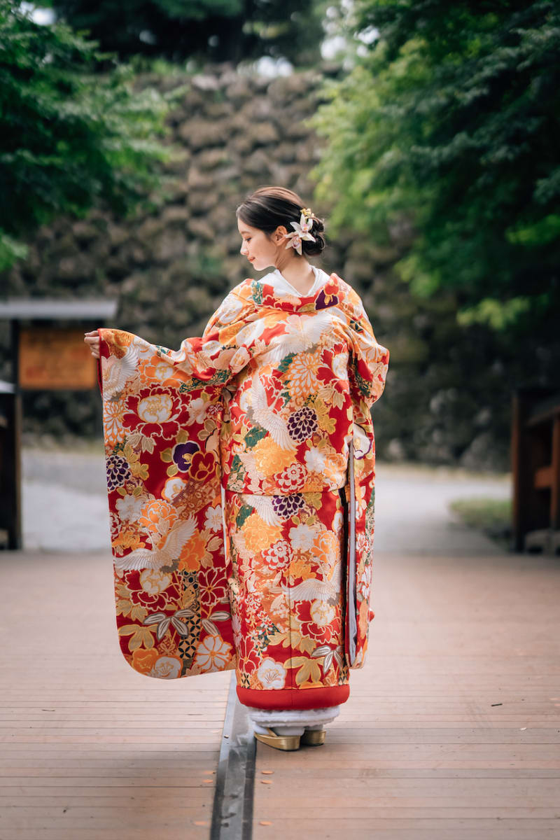 鶴や花々があしらわれた色打掛は、