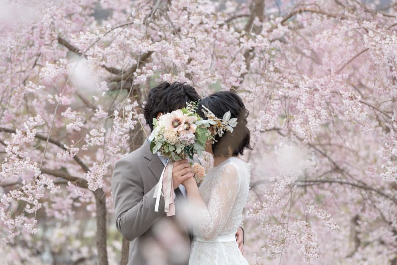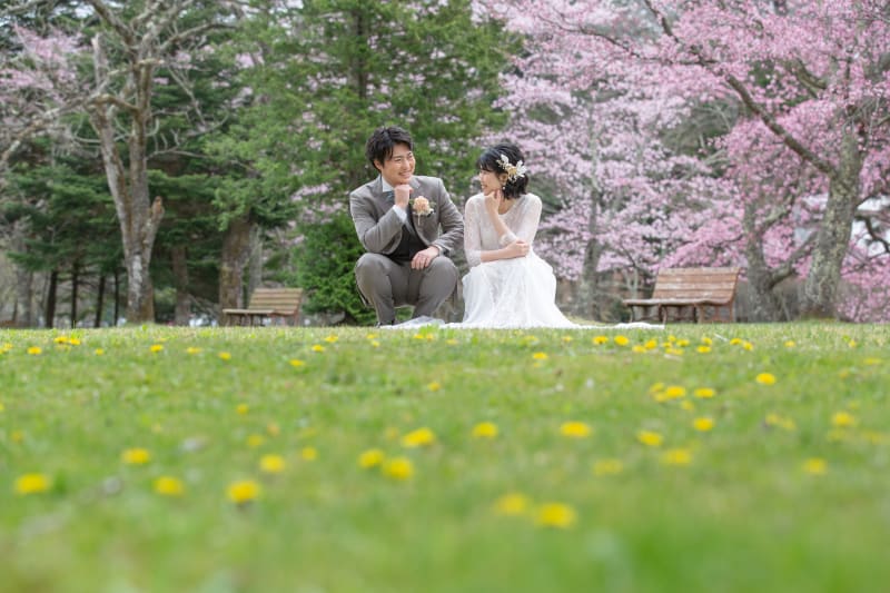 ドレスとタキシードに、濃いピンク色の桜がとっても可愛らしかったです!♡