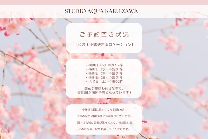 和装なら【小諸懐古園】が4/13頃満開予定なので、その前後での撮影が特におすすめ♡