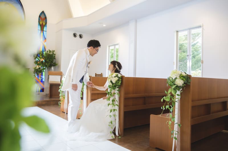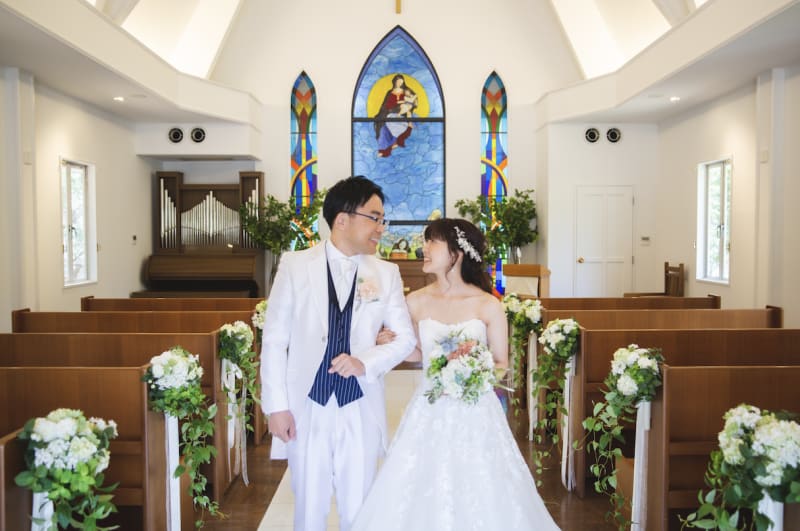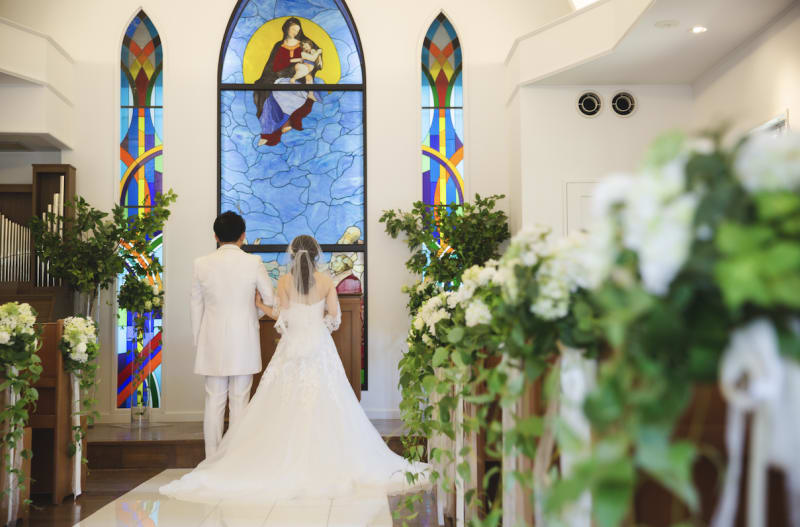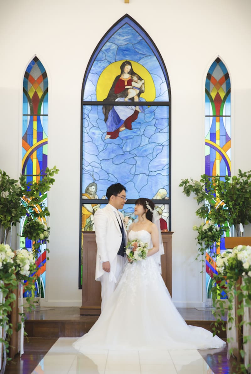 洋装は、ステンドガラスの綺麗な「ゆとりろチャペル」