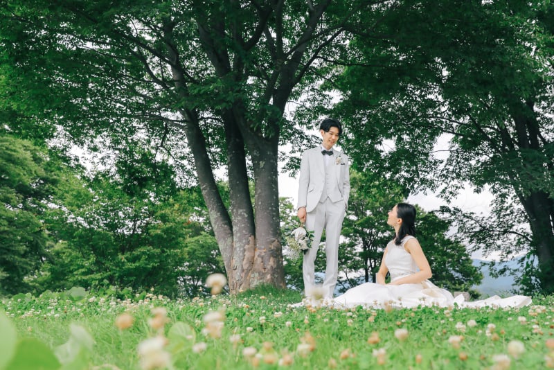 こちらもシロツメクサと大きな樹があり、軽井沢ならではの撮影の良さを