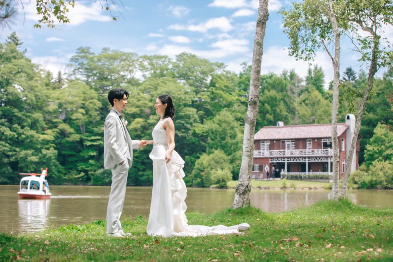 湖と洋館を背景に、白樺の樹がとても軽井沢らしくて素敵ですね♬