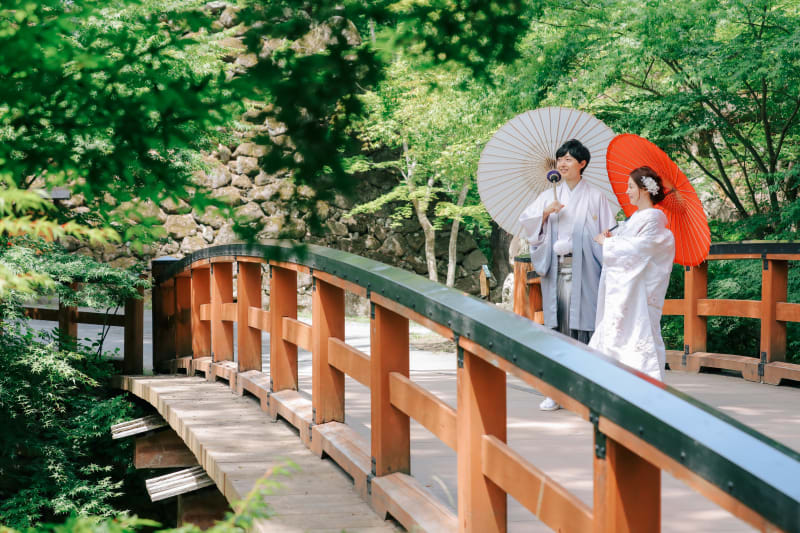 木造りの橋は和装にとても合いますね! 紅白の番傘もいいワンポイントになってて素敵です♡