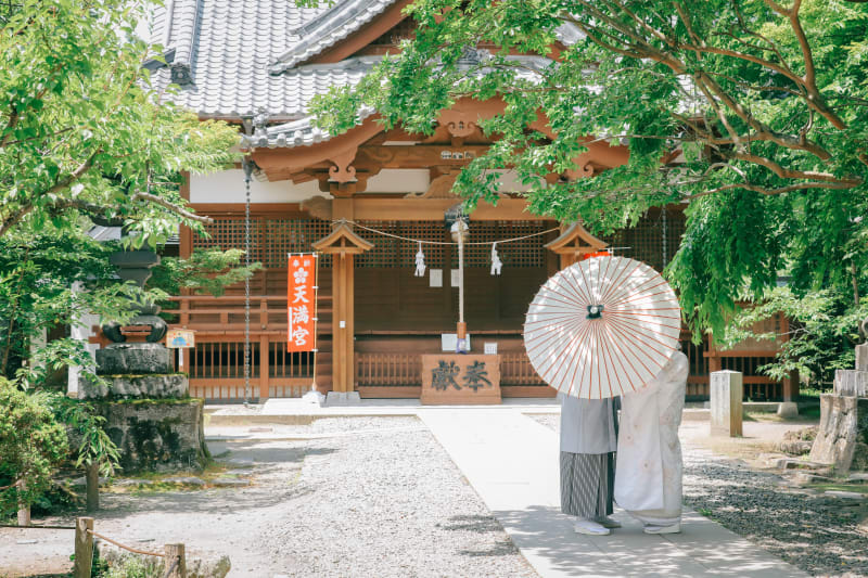 神社の佇まいと、傘で身を隠しているお二人の雰囲気がグッドです♡