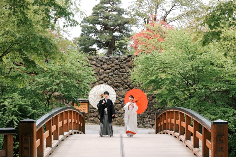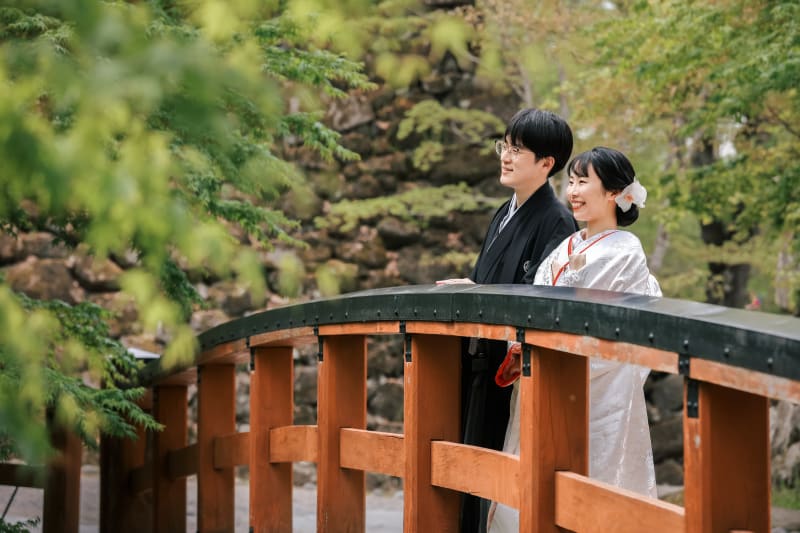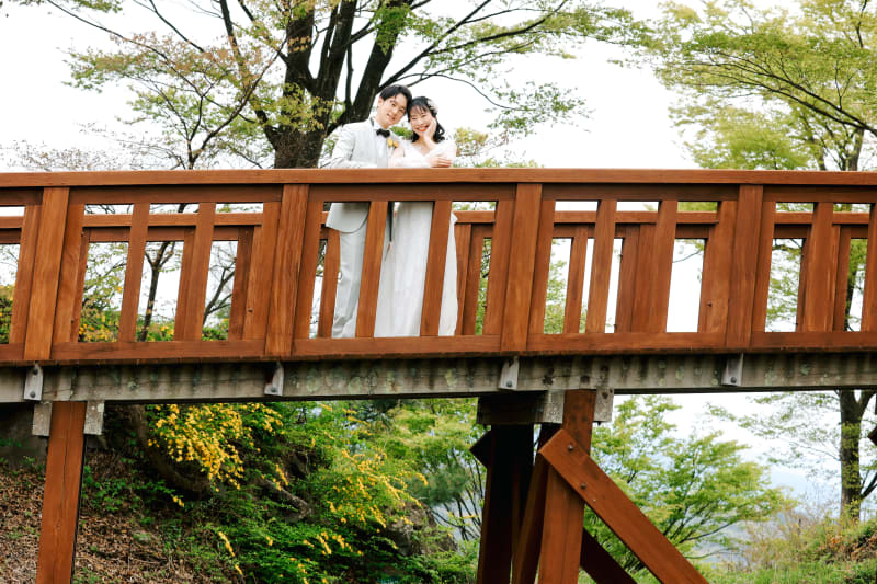 その名の通り、秋には紅葉、夏には新緑が美しい【紅葉谷】には橋がかかっており、和装のお姿をより一層引き立ててくれます♪