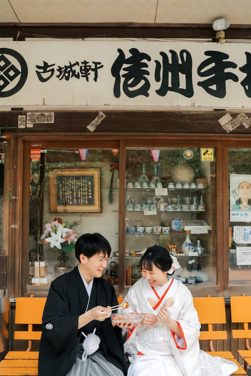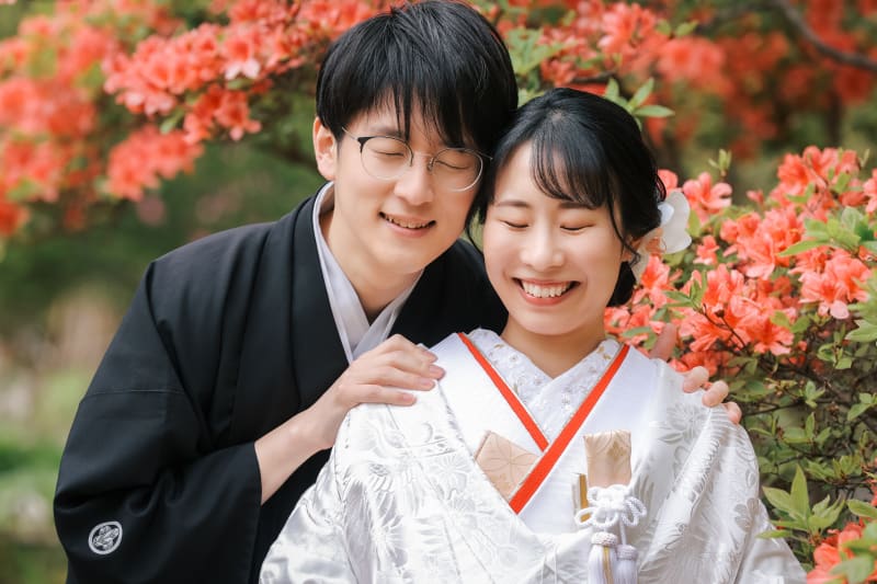 この日は紅梅色のツツジが綺麗に咲いており、お二人の和装撮影に彩りを添えてくれました♡