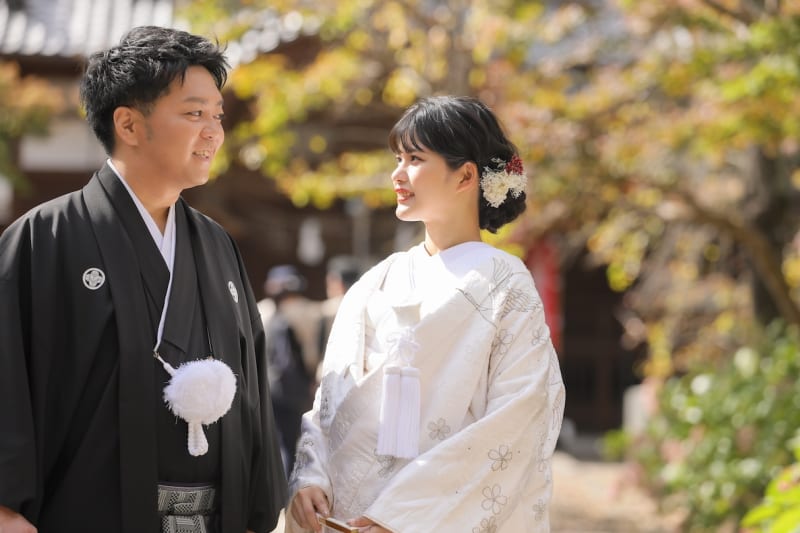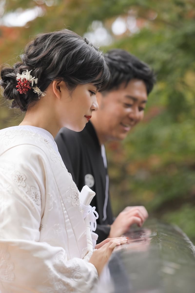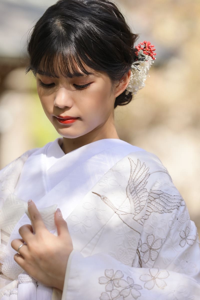髪飾りも和っぽくドライフラワーで仕上げています。