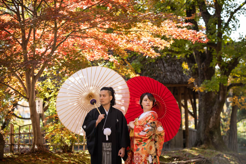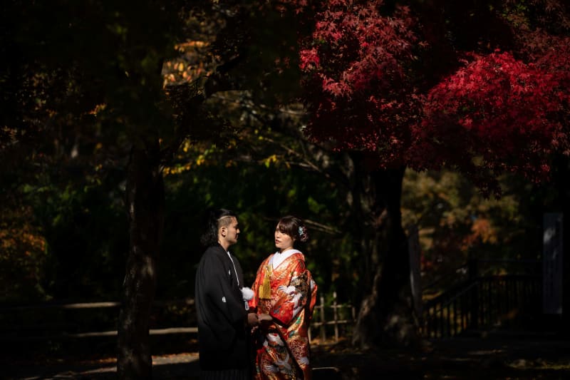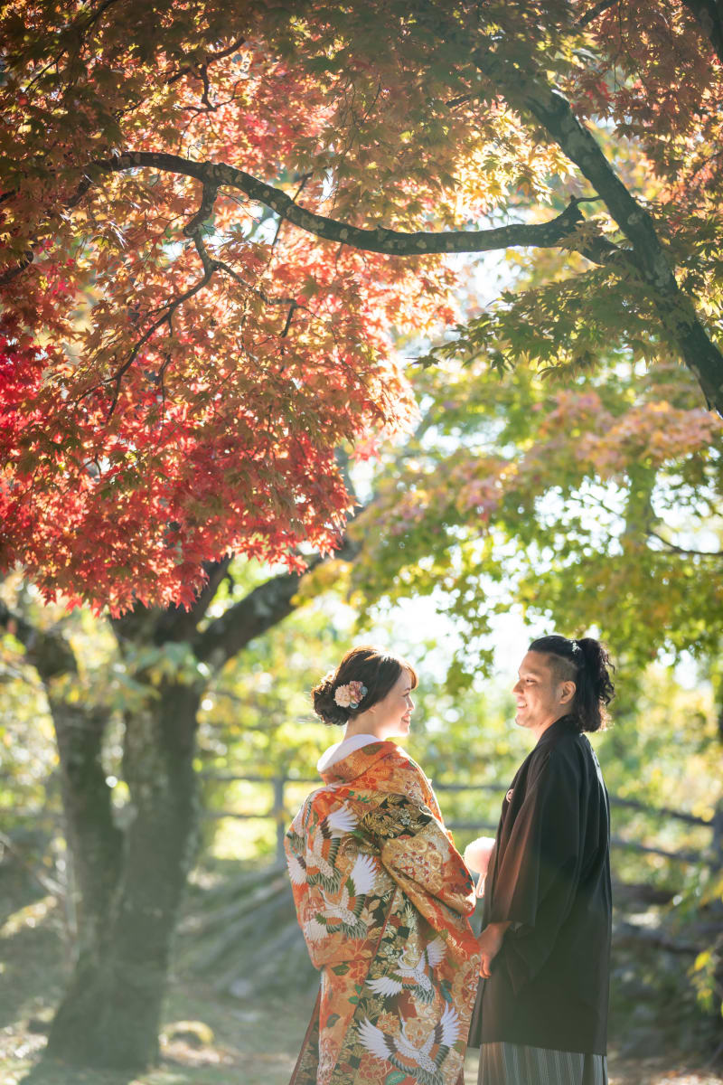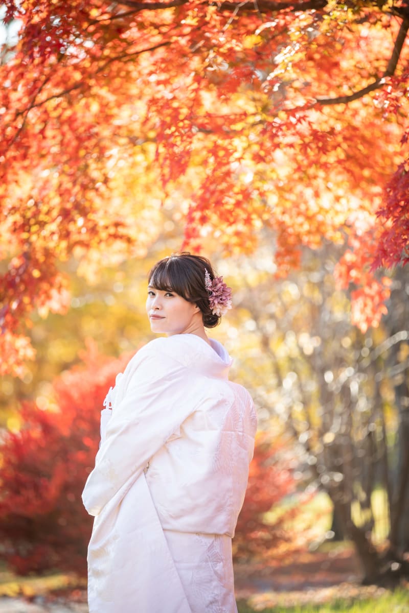 一枚白無垢に掛け替えして撮影しましょう。白無垢に紅葉、とてもマッチしてます。