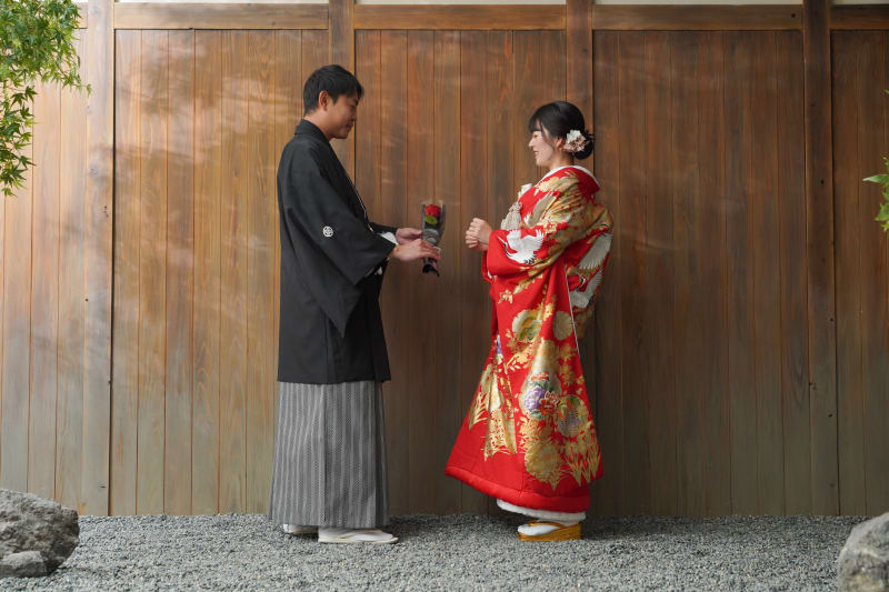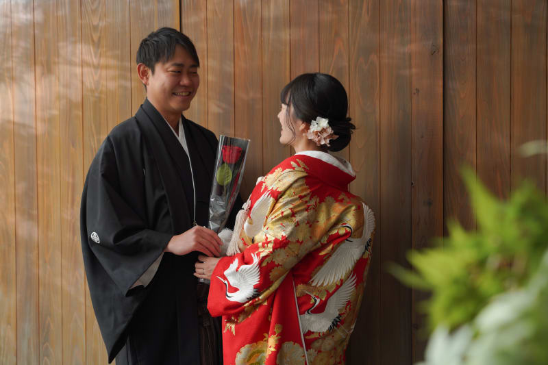 ゆっくりと歩み寄った先にいるご新婦様へ、持っていたバラをお渡しするご新郎様。