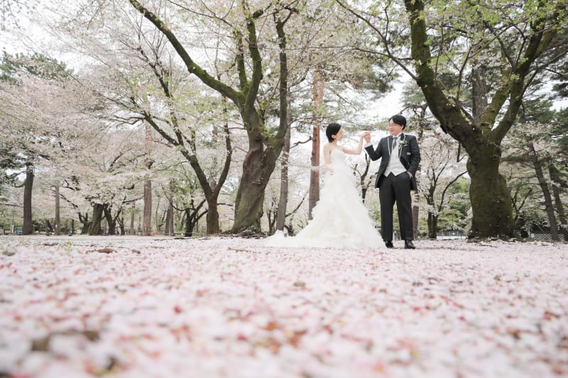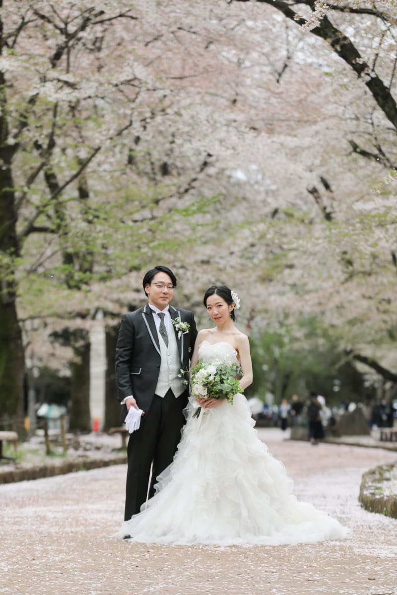 新婦様のウェディングドレスがとても可愛いです。桜とマッチしてとてもお似合いです。