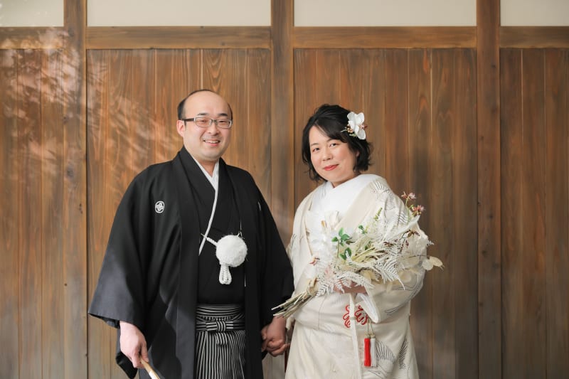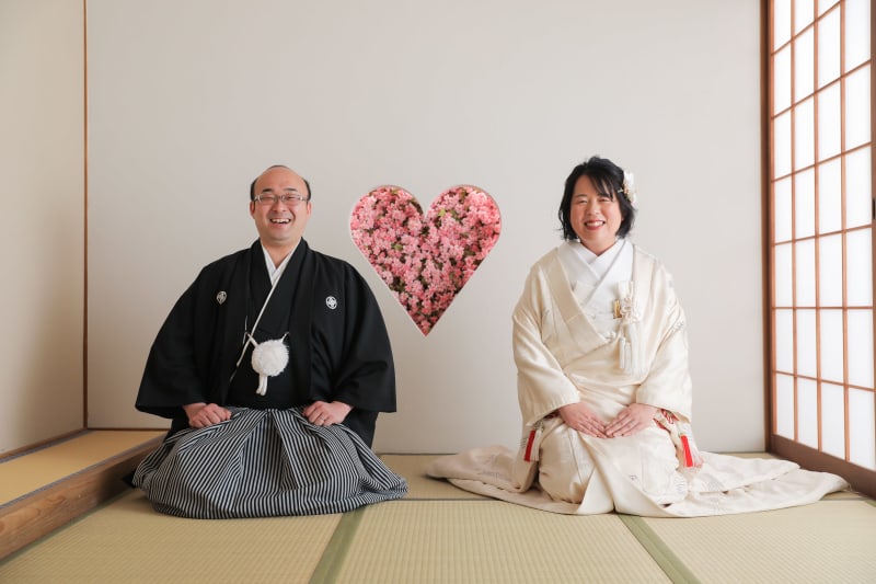お花に囲まれての撮影で、お二人の笑顔も明るいですね。